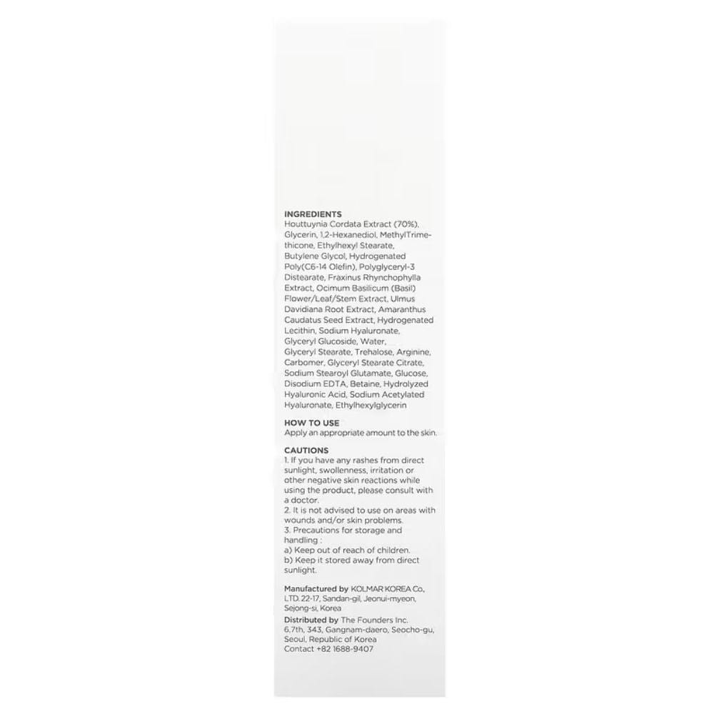 Water, Glycerin, 1,2-Hexanediol, Butylene Glycol, Houttuynia Cordata Extract, Glyceryl Stearate, Arginine, Carbomer, Ethylhexylglycerin, Sodium Stearoyl Glutamate, Glucose, Ulmus Davidiana Root Extract, Amaranthus Caudatus Seed Extract, Hydrogenated Lecithin, Tocopherol, Hydrolyzed Hyaluronic Acid, Sodium Acetylated Hyaluronate, Ethylhexyl Stearate, Trehalose, Laminaria Japonica Extract, Eclipta Prostrata Leaf Extract, Sodium Hyaluronate Skin, Beta-Glucan, Betaine, Ficus Carica (Fig) Fruit Extract, Glyceryl Glucoside, Glyceryl Stearate Citrate, Polyglyceryl-3 Distearate, Squalane, Fructooligosaccharides, Hydrogenated Poly(C6-14 Olefin), Butyrospermum Parkii (Shea) Butter, Centella Asiatica Extract, Methylpropanediol, Fraxinus Rhynchophylla Extract, Ceramide Np, Cetearyl Glucoside, Ocimum Basilicum Flower/Leaf/Stem Extract, Disodium EDTA, Sodium Hyaluronate, Methyl Trimethicone, Caprylic/Capric Triglyceride, Cetearyl Alcohol, Dipropylene Glycol.