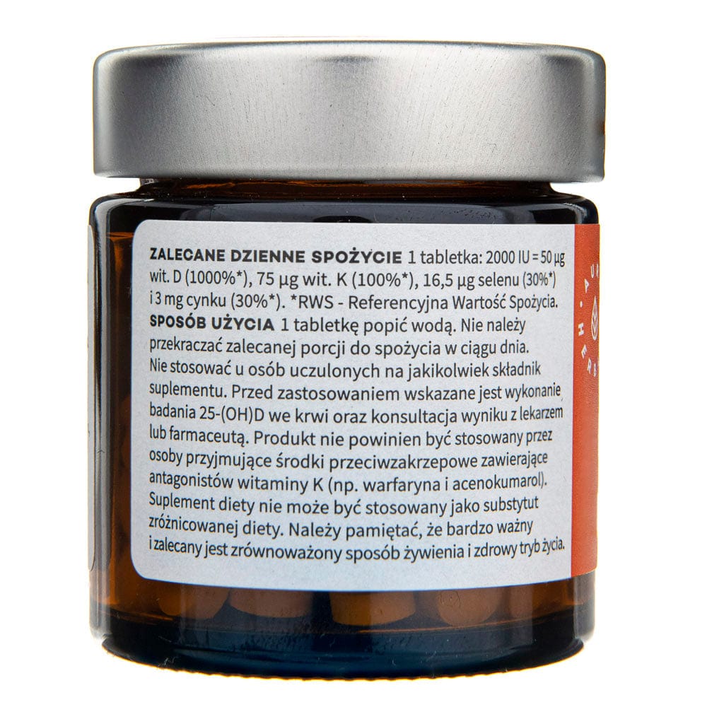Dietary supplement in tablets from Aura Herbals containing vitamin D3 in a dose of 2000 IU, vitamin K2mk7, selenium in the form of natural selenium yeast and zinc. For its production, we used certified vitamin D - Quali®-D. This is the highest quality vitamin D obtained from lanolin, the wool of live and healthy sheep, living on Australian and New Zealand pastures. Thanks to finely dispersed particles obtained in specialized Swiss laboratories, Quali®-D is characterized by a very stable form. Thanks to this innovative process, Aura Herbals contains vitamin D of natural origin, which is even faster and easier absorbed by the human body.