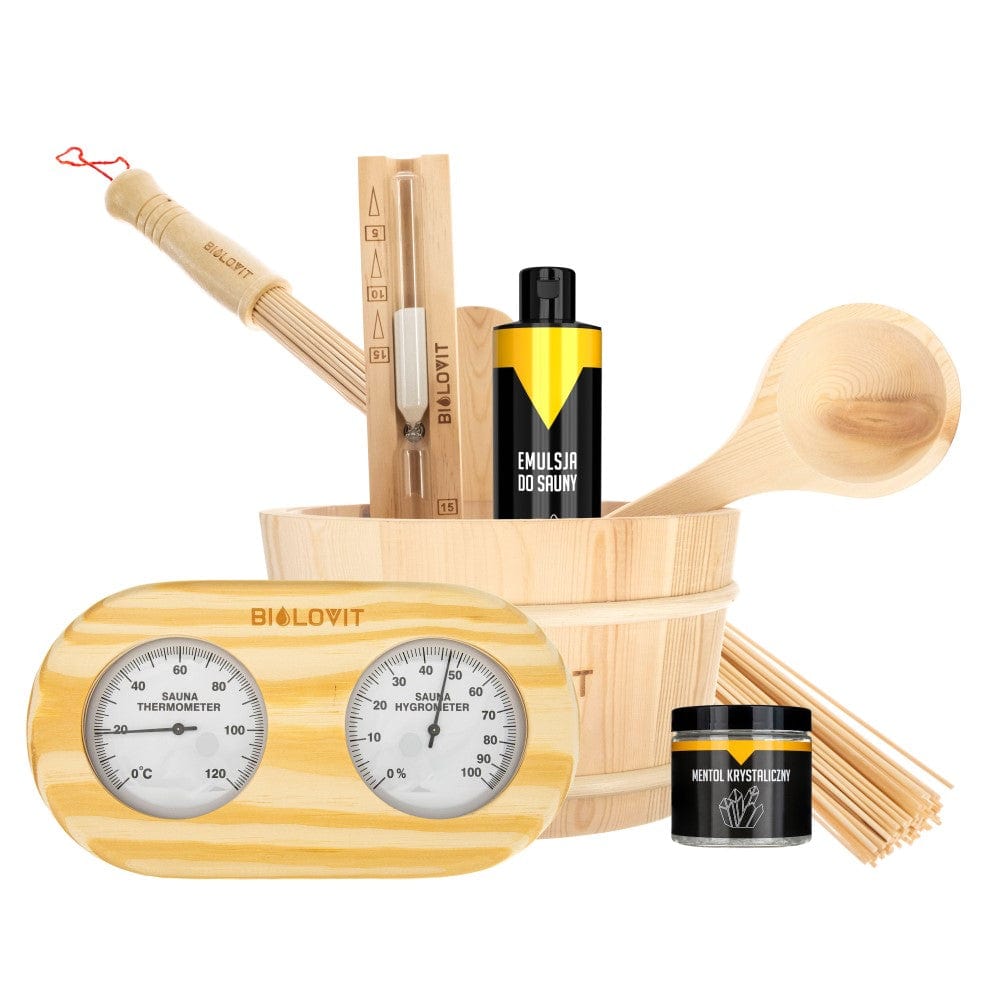 The Bilovit Sauna Accessories Set is an essential set for every sauna lover. It contains 7 items: bucket with ladle for pouring stones, thermometer with hygrometer, bamboo vittles, hourglass, crystal menthol and pine-scented sauna emulsion. Each piece is made of high quality materials for durability and aesthetics. Ideal for home use as well as in commercial saunas, the Bilovit set will complement any sauna session with luxury and comfort.