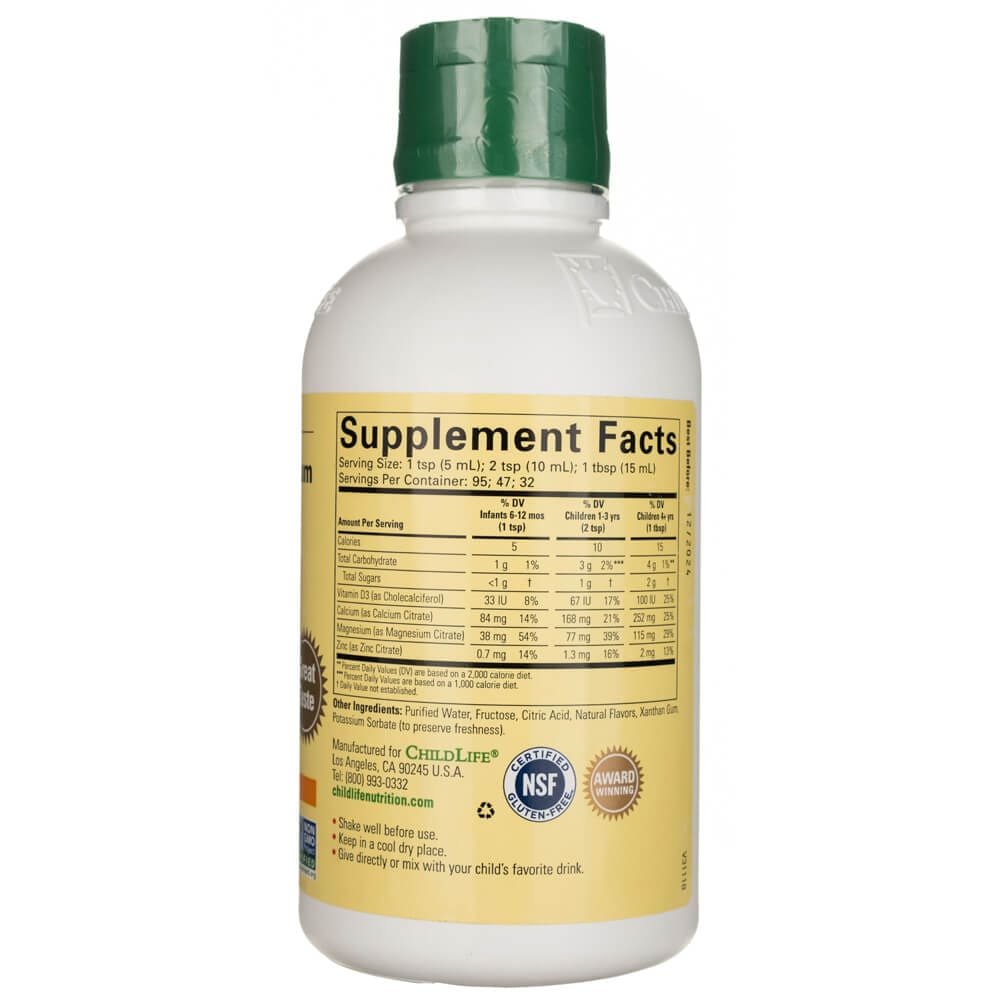 Liquid Calcium with Magnesium by ChildLife, is an orange-flavored liquid dietary supplement containing calcium, magnesium, zinc and vitamin D - essential nutrients that support healthy bone growth and development in children.