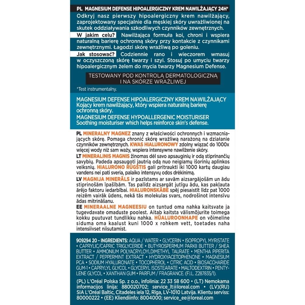 L'Oréal Paris Men Expert Magnesium Defense Hypoallergenic Moisturising Cream is an intensely moisturising cream specially formulated for men with sensitive skin. Thanks to its magnesium and hyaluronic acid content, the cream soothes, moisturises and strengthens the skin's natural barrier to protect it from pollution and irritation, especially after shaving.