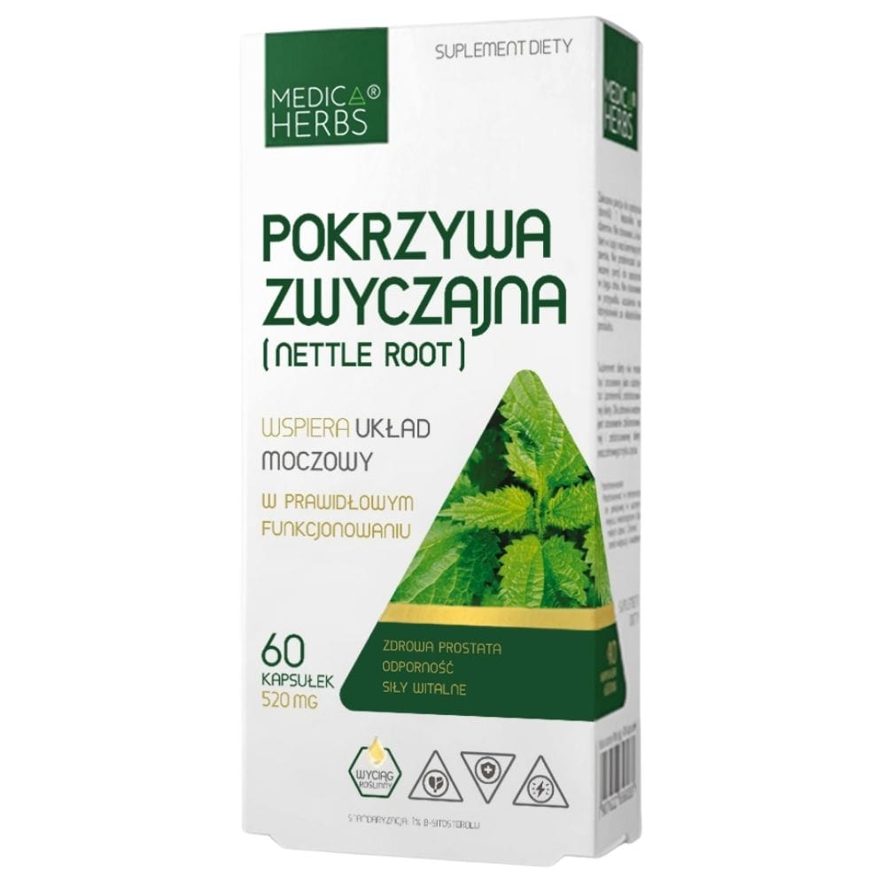 Medica Herbs Common Nettle (Nettle Root) is a dietary supplement in capsules. Source of Urtica dioica root extract, standardised to 1% β-sitosterol. It provides 520 mg of nettle root extract in 1 capsule.