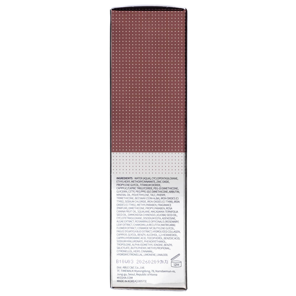 Water (Aqua), Cyclopentasiloxane, Ethylhexyl Methoxycinnamate, Zinc Oxide, Propylene Glycol, Titanium Dioxide, Caprylic/Capric Triglyceride, PEG-10 Dimethicone , Glycerin, Arbutin, Cetyl PEG/PPG-10/1 Dimethicone, Mineral Oil, Polyethylene, Talc, Beeswax (Cera Alba), Phenyl Trimethicone, Iron Oxides (CI 77492), Sodium Chloride, Iron Oxides (CI 77491), Iron Oxides (CI 77499), Fragrance, Methylparaben, Dimethicone, Macadamia Ternifolia Seed Oil, Propylparaben, Rosa Canina Fruit Oil, Simmondsia Chinensis (Jojoba) Seed Oil, Squalane , Disodium EDTA, Adenosine, Butylene Glycol , Ceramide NP, Fagus Sylvatica Bud Extract, Hydrolyzed Collagen, Chamomilla Recutita (Matricaria) Flower Extract, Hizikia Fusiforme Extract, Laminaria Japonica Extract, Rosmarinus Officinalis (Rosemary) Leaf Extract, Caprylyl Glycol, Benzyl Alcohol, 1,2-Hexanediol, Caprylhydroxamic Acid, Sodium Hyaluronate, Phenoxyethanol, Benzoic Acid, Tropolone, Alpha-Isomethyl Ionone, Benzyl Salicylate, Citronellol, Limonene, Hexyl Cinnamal, Hydroxycitronellal, Linalool.
