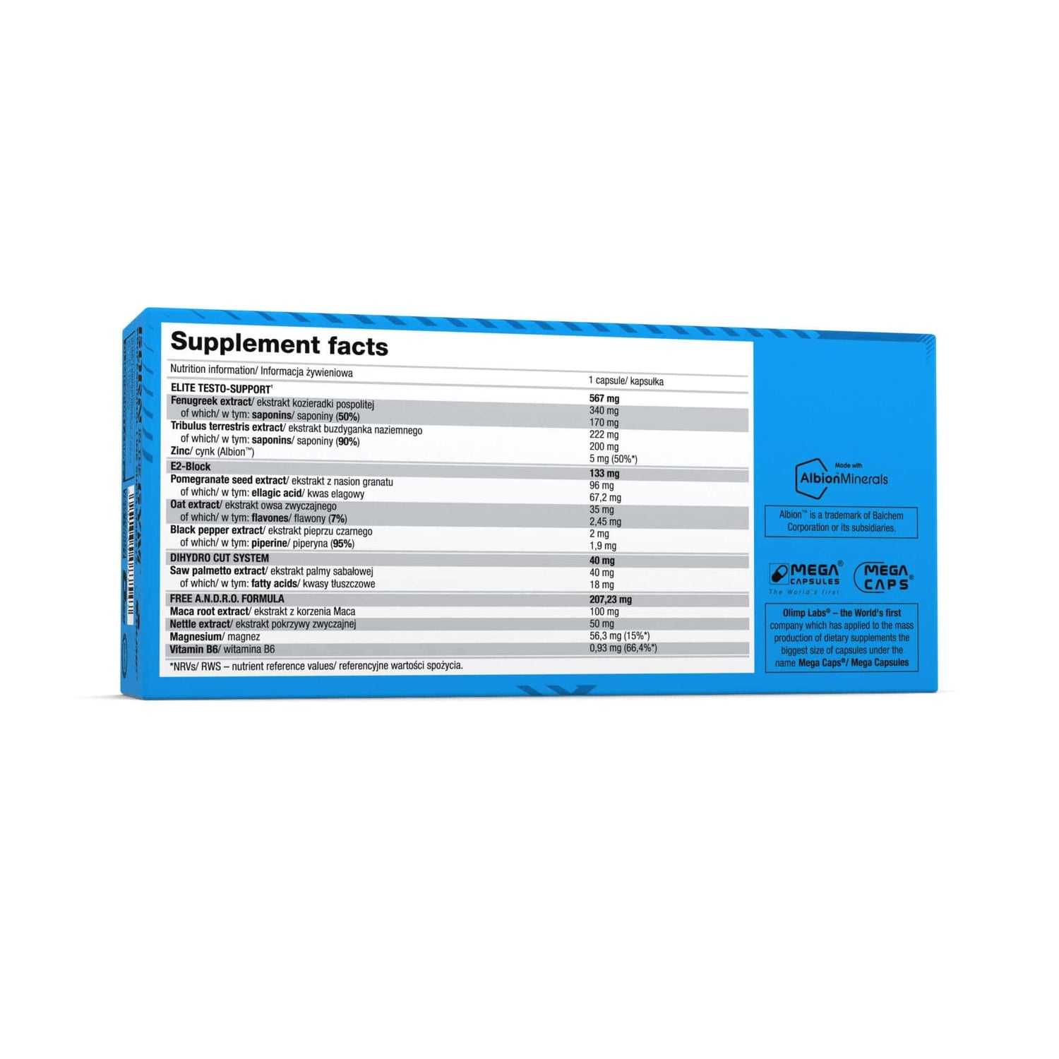 Fenugreek seed extract (Trigonella foenum-graecum L.), Tribulus terrestris fruit extract (Tribulus terrestris L.; 90% saponins), Maca root extract (Lepidjum meyenii Walp.), magnesium malate, Pomegranate seed extract (Punica granatum L.), Tribulus terrestris fruit extract (Tribulus terrestris L.; 60% saponins), bulking agent — microcrystalline cellulose; nettle herb extract (Urtica dioica L.), Saw palmetto fruit extract (Serenoa repens), oat herb extract (Avena sativa L.), anti-caking agents — magnesium salts of fatty acids, silicon dioxide; zinc bisglycinate (zinc amino acid chelate Albion™), black pepper fruit extract (Piper nigrum L.), pyridoxine hydrochloride — vit. B6, capsule (gelatine, colour: E 132).