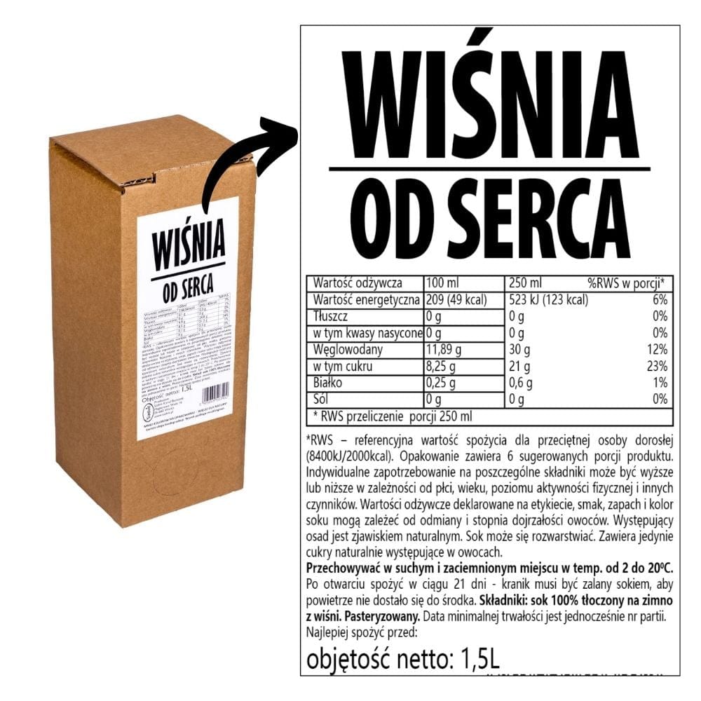 Sadvit Cherry Juice Cherry from the Heart 100% is NFC (not from concentrate) cold-pressed juice containing only the cherry fruit. Pasteurised, without added sugar or flavour enhancers. The cherry has a slightly sour taste, but is ideal as an addition to tea, juices, cocktails or wines.