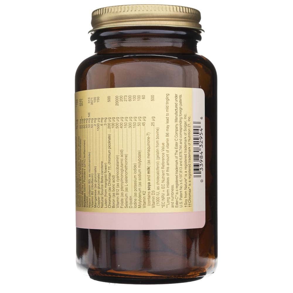 Calcium (citrate, ascorbate), bulking agents: Microcrystalline cellulose, dicalcium phosphate, alginate, pea starch, dextrin, hydroxypropyl cellulose, modified food starch, magnesium (as citrate, oxide), Vitamin C (as ester-C, calcium ascorbate), Vitamin E (as D-alpha tocopheryl acid succinate), citrus bioflavonoid complex, anti-caking substances: vegetable stearic acid, silicon dioxide, vegetable magnesium stearate, cellulose gum, choline (as diquinate), glazing agents: hydroxypropylmethylcellulose, vegetable glycerine (from palm kernel oil and coconut oil), Pantothenic acid (as D-pantothenate, calcium), Zinc (as picolinate), Colours: Purple carrot powder, Titanium dioxide, Thiamine (vitamin B1 as thiamine mononitrate), Vitamin B6 (as pyridoxine HCl), Soybean germ powder ([2%] isoflavones), Inositol, niacin (vitamin B3, as nicotinamide), vitamin B2 (riboflavin), manganese (as gluconate), copper (as gluconate), natural source of beta-carotene, Lutein (from marigold flower), Chromium (as C hromax, chromium picolinate), boron (as boric acid), vitamin B12 (as cyanocobalamin), folate (as pteroylmonoglutamic acid), selenium (as L-selenomethionine), D-biotin, iodine (as potassium iodide), molybdenum (as sodium molybdate), vitamin K2 (contains soy and milk) (as menaquinone-7), vitamin D3 (as cholecalciferol) (beef gelatine).