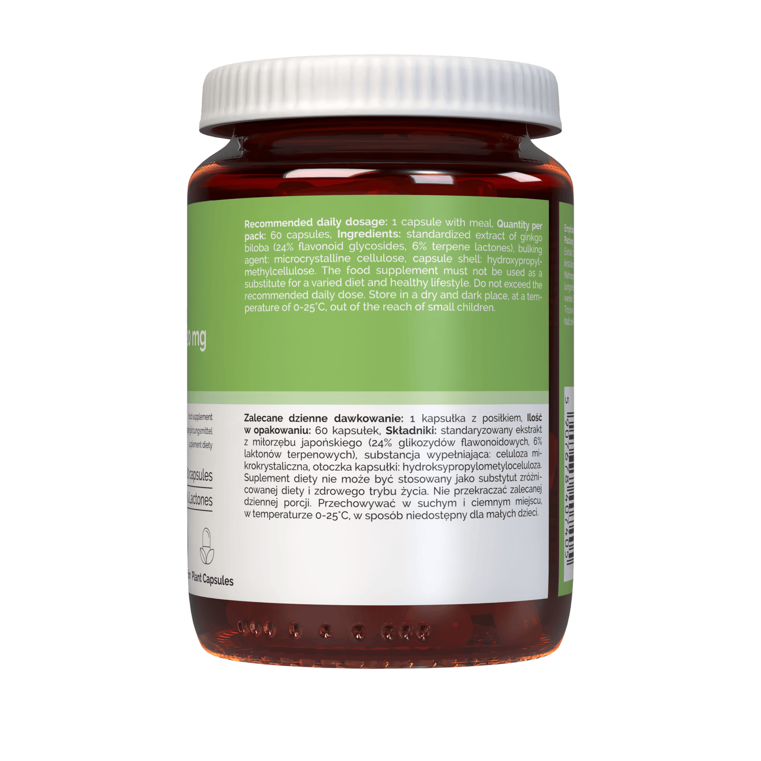 Vitaler's Ginkgo Biloba 120 mg is a dietary supplement in capsule form containing standardised extract from the leaves of the Japanese ginkgo tree (24% flavonoid glycosides, 6% terpene lactones). 120 mg of extract in one capsule. HPMC capsule suitable for vegans. Does not contain: colourings, flavourings, added sugar, preservatives, dairy products, sweeteners.