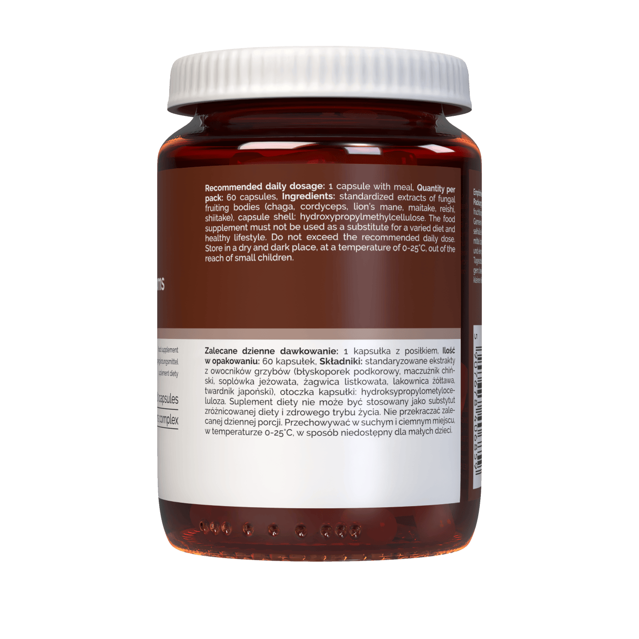 A unique combination of six medicinal mushrooms standardised for polysaccharides (a substance naturally occurring in mushrooms). Mushrooms have a thousand-year-old tradition and have long been used in traditional medicine. They have immunostimulatory, hepatoprotective, antimicrobial and antioxidant properties.